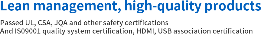 Passed UL, CSA, JQA and other safety certifications, as well as ISO9001 quality system certification, HDMI, USB Association certification